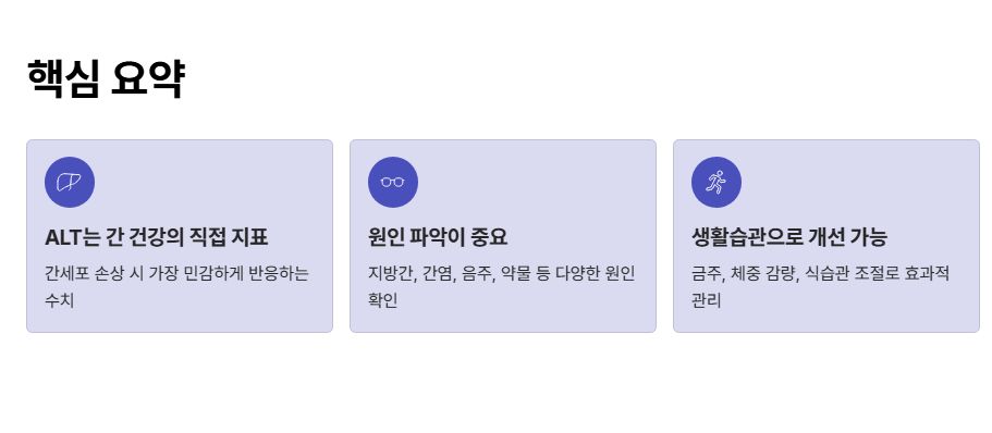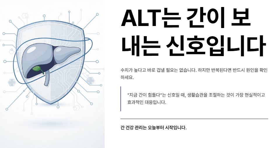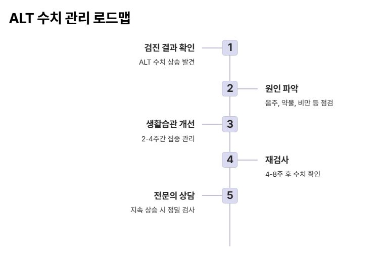 정리하면, ALT 수치는 간 건강을 가장 직접적으로 보여주는 지표입니다. 수치가 높게 나왔다고 바로 겁낼 필요는 없지만, 반복된다면 반드시 원인을 확인해야 합니다. ALT는 “지금 간이 힘들다”는 신호이므로, 이때 생활습관을 조절하는 것이 가장 현실적이고 효과적인 대응입니다.