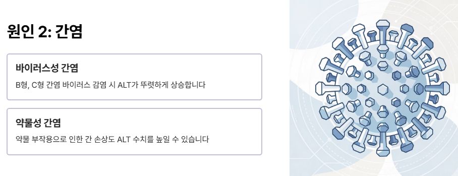 바이러스성 간염이나 약물성 간염이 있을 때 ALT가 뚜렷하게 상승합니다.