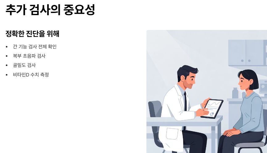 • 간·담도 원인 → 금주, 지방간 관리, 추가 검사