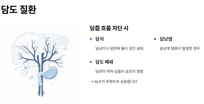 담석, 담낭염, 담도 폐쇄처럼 담즙 흐름이 막히면 ALP가 뚜렷하게 상승합니다.