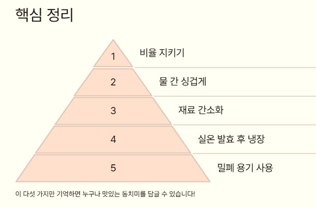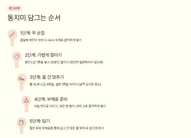 정리하면, 동치미 쉽게 담그는 법의 핵심은 재료를 줄이고 물 간을 정확히 맞추는 것입니다. 어렵게 생각할수록 실패 확률이 높아집니다. 오늘 한 번만 담가보면, 다음부터는 굳이 레시피를 찾지 않아도 될 만큼 손에 익게 됩니다.