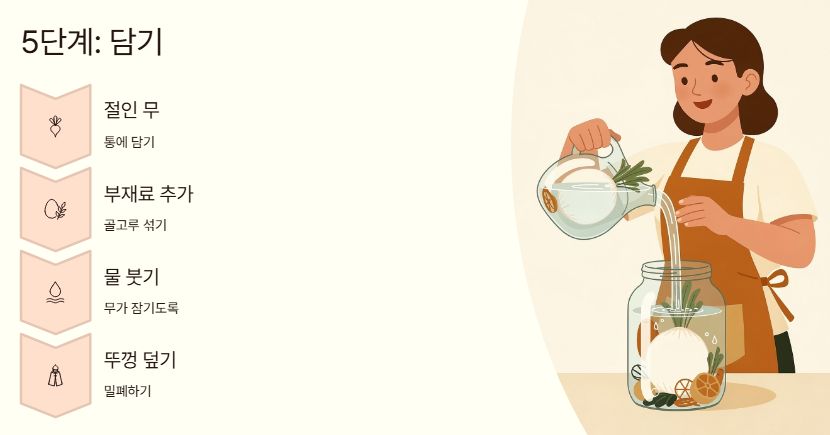 절인 무와 부재료를 통에 담고, 간 맞춘 물을 부어 무가 잠기게 합니다.