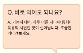 A. 가능하지만, 하루 이틀 지나야 동치미 특유의 시원한 맛이 살아납니다.