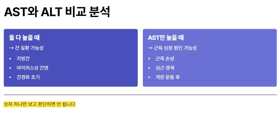 AST는 단독으로 보기보다 ALT 수치와 함께 비교하는 것이 중요합니다.