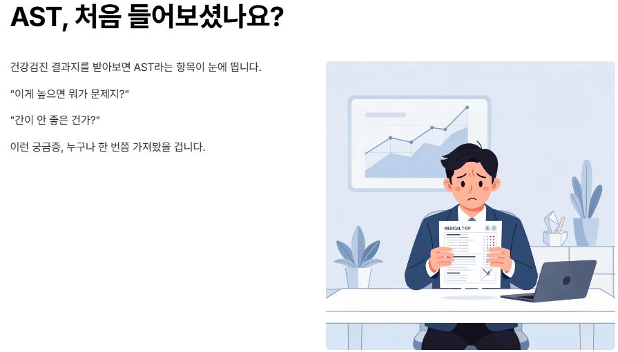 쉽게 말하면, AST는 간뿐 아니라 몸속 조직이 손상될 때 혈액으로 새어 나오는 수치입니다.