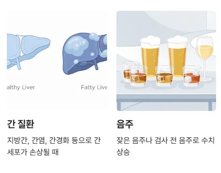 술을 자주 마시거나 검사 전 음주가 있으면 AST 수치가 쉽게 올라갈 수 있습니다.